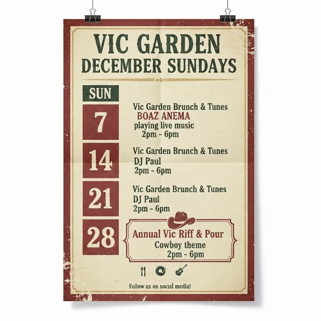 Celebrate the last month of December 2025 in our Garden Bar. Live music Every Sunday in December 2pm - 6pm.