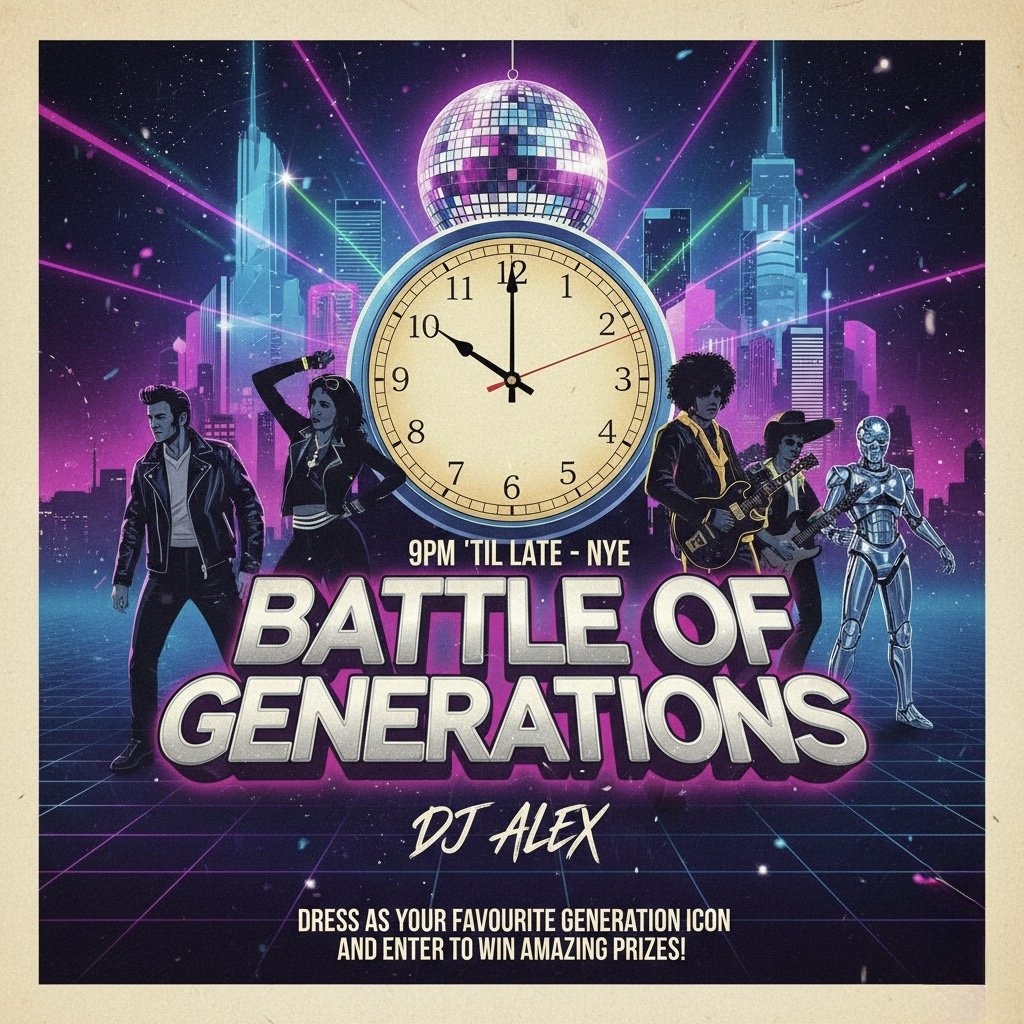 Come dressed up as your favorite generations icon and win amazing prizes. DJ Alex playing tunes from different decades every hour. 31st December 2025 (9pm - Late)